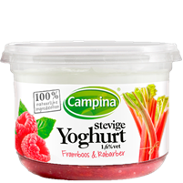 Campina Stevige yoghurt Framboos & Rabarber is een heerlijk stevige en milde yoghurt met een verrassende combinatie van frambozen en rabarber.